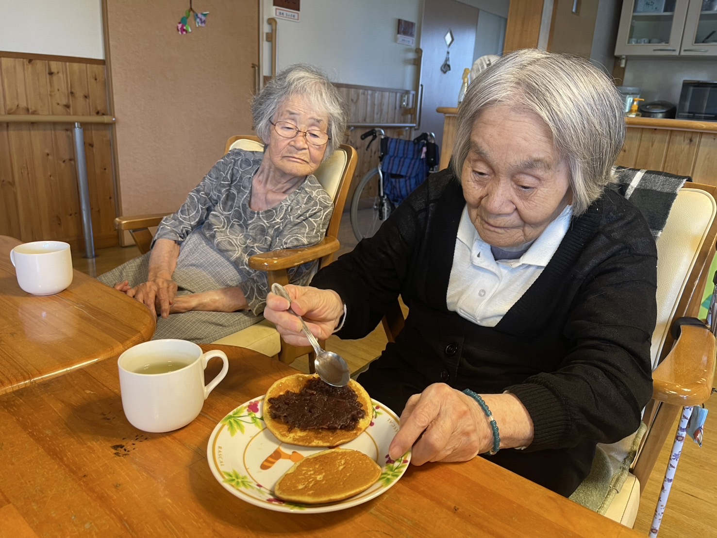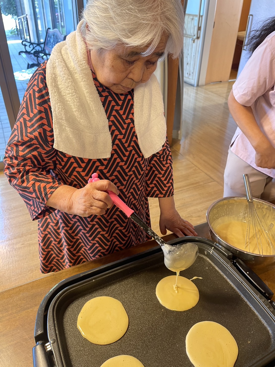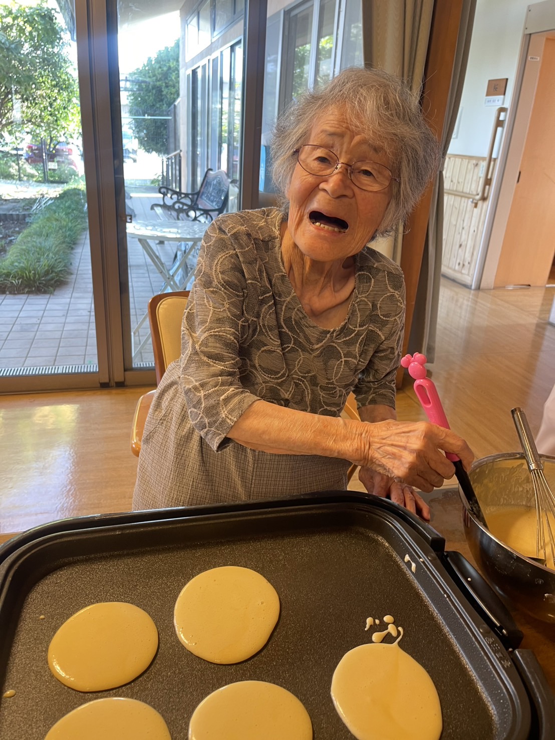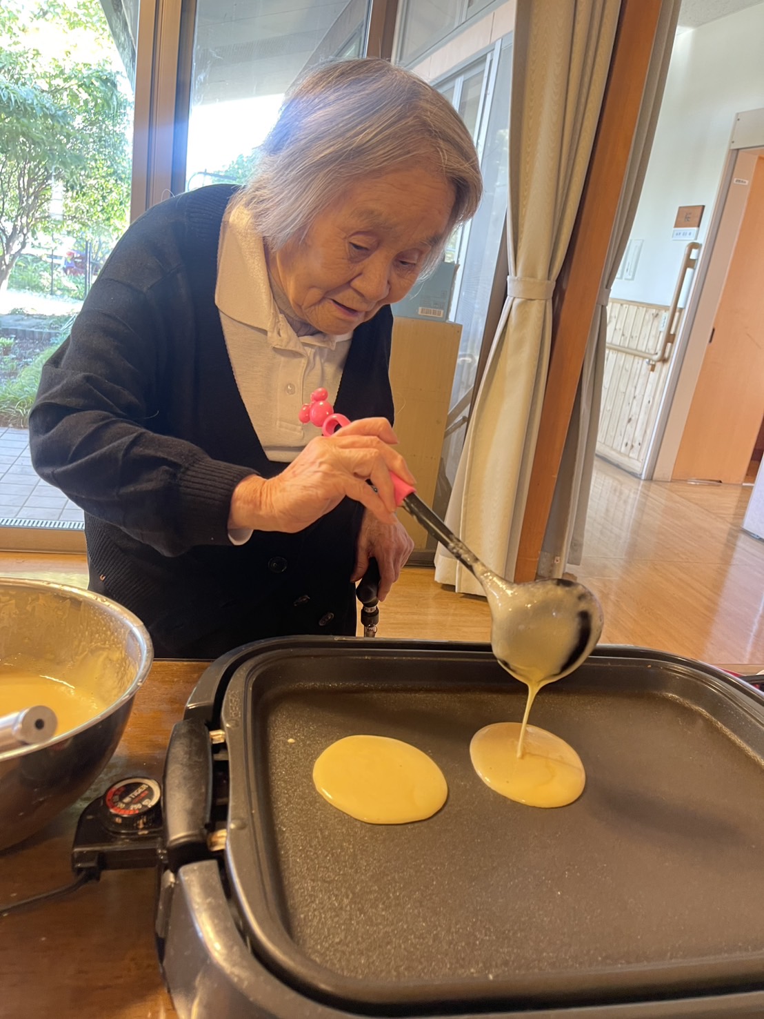 少し涼しくなってきたので、おやつに「どら焼き」を作りました。「自分の分は自分で焼いてみましょう!」ということで、みなさんに挑戦してもらいました。みなさん上手に生地を流して丸く焼いてくださいました。