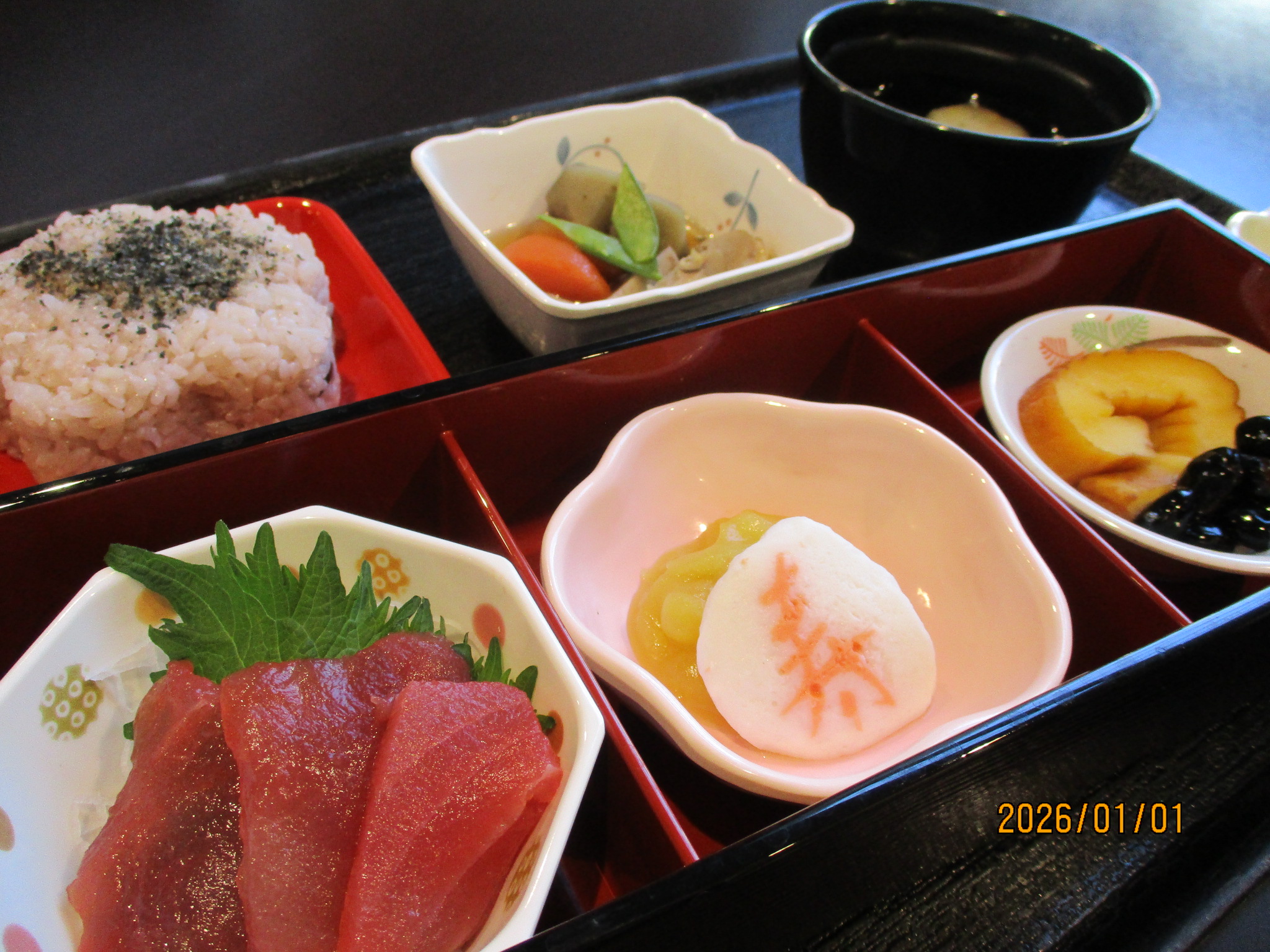 あけましておめでとうございます。本年もよろしくお願いいたします。1/1昼食はおせちを提供しました。食事の感想を伺いにユニットへおじゃましましたが、どのご利用者もとても満足そうにおせち料理を召し上がっていました。美味しくいただけたようで良かったです。