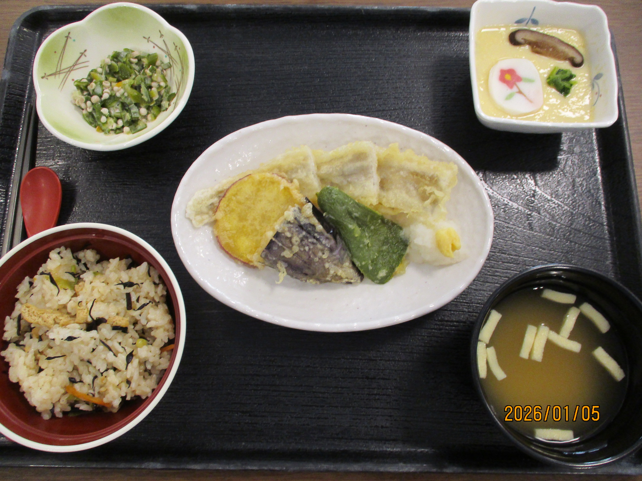 1月誕生日食です。和食が食べたいとリクエストをいただいたため、炊き込みご飯と天ぷらを提供しました。