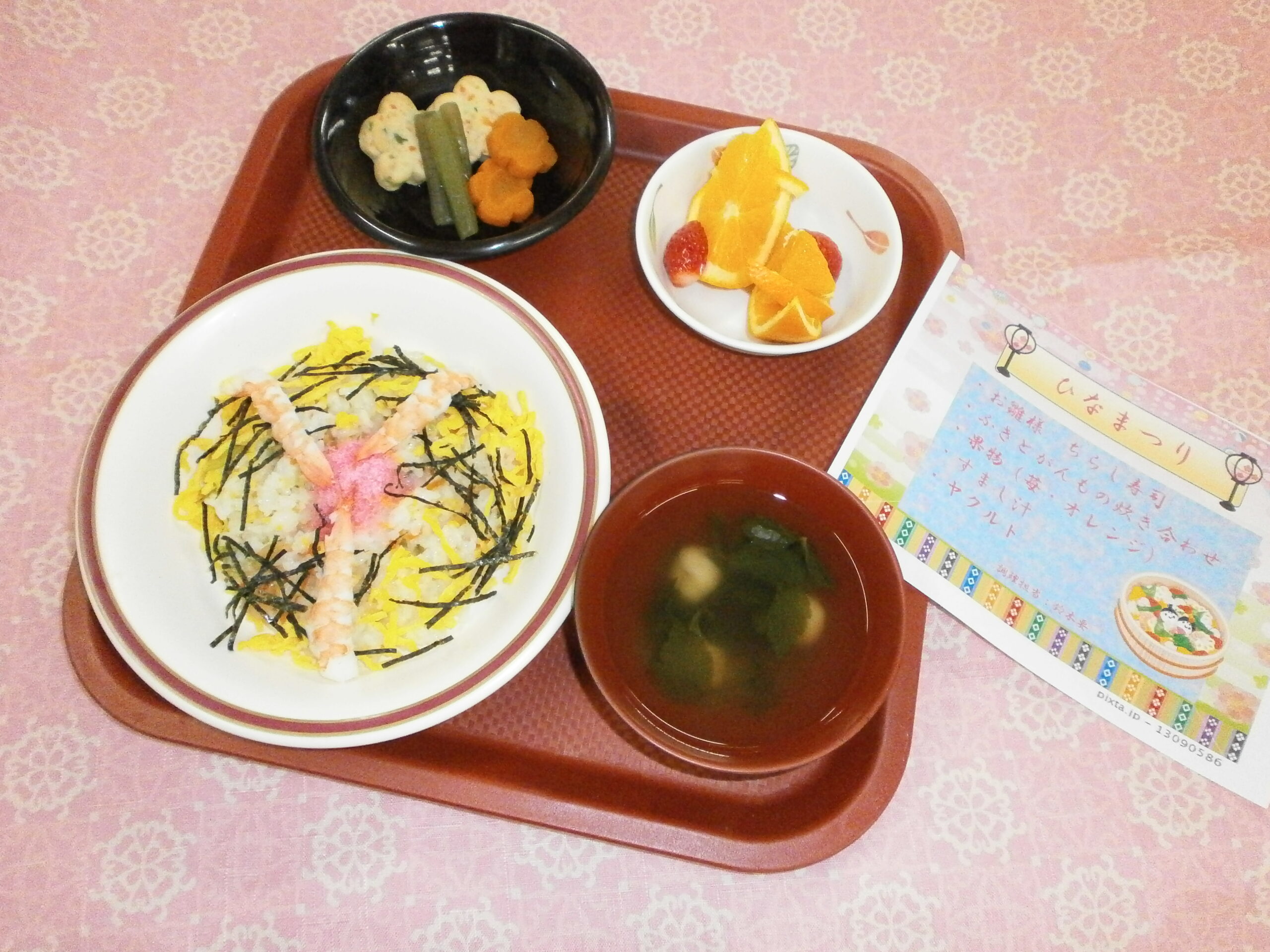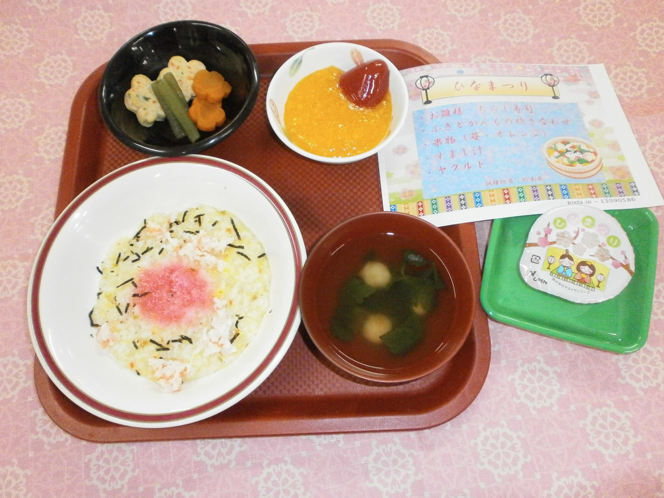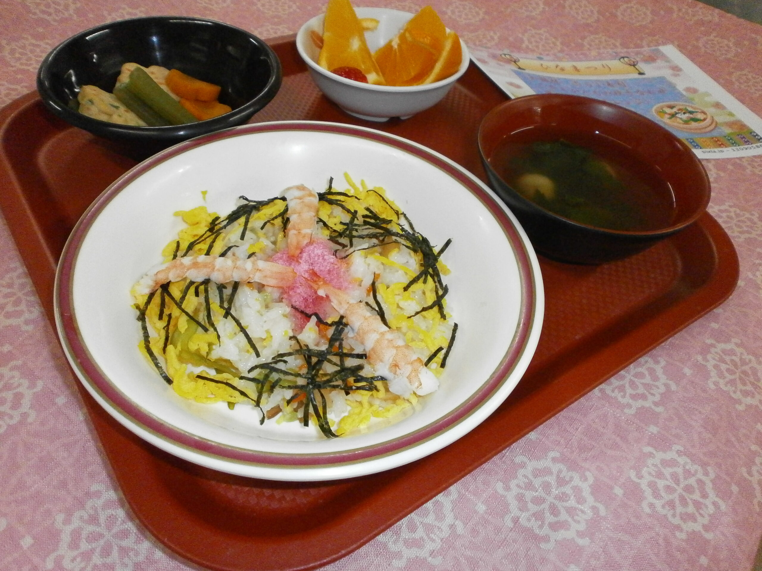 あいにくの雨模様ですが、今日はひな祭りということでちらし寿司を提供しました。