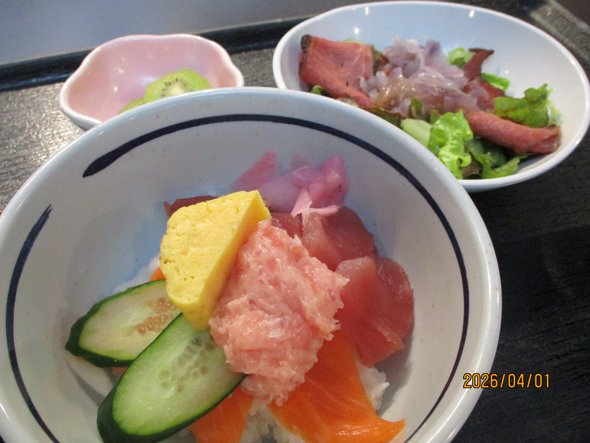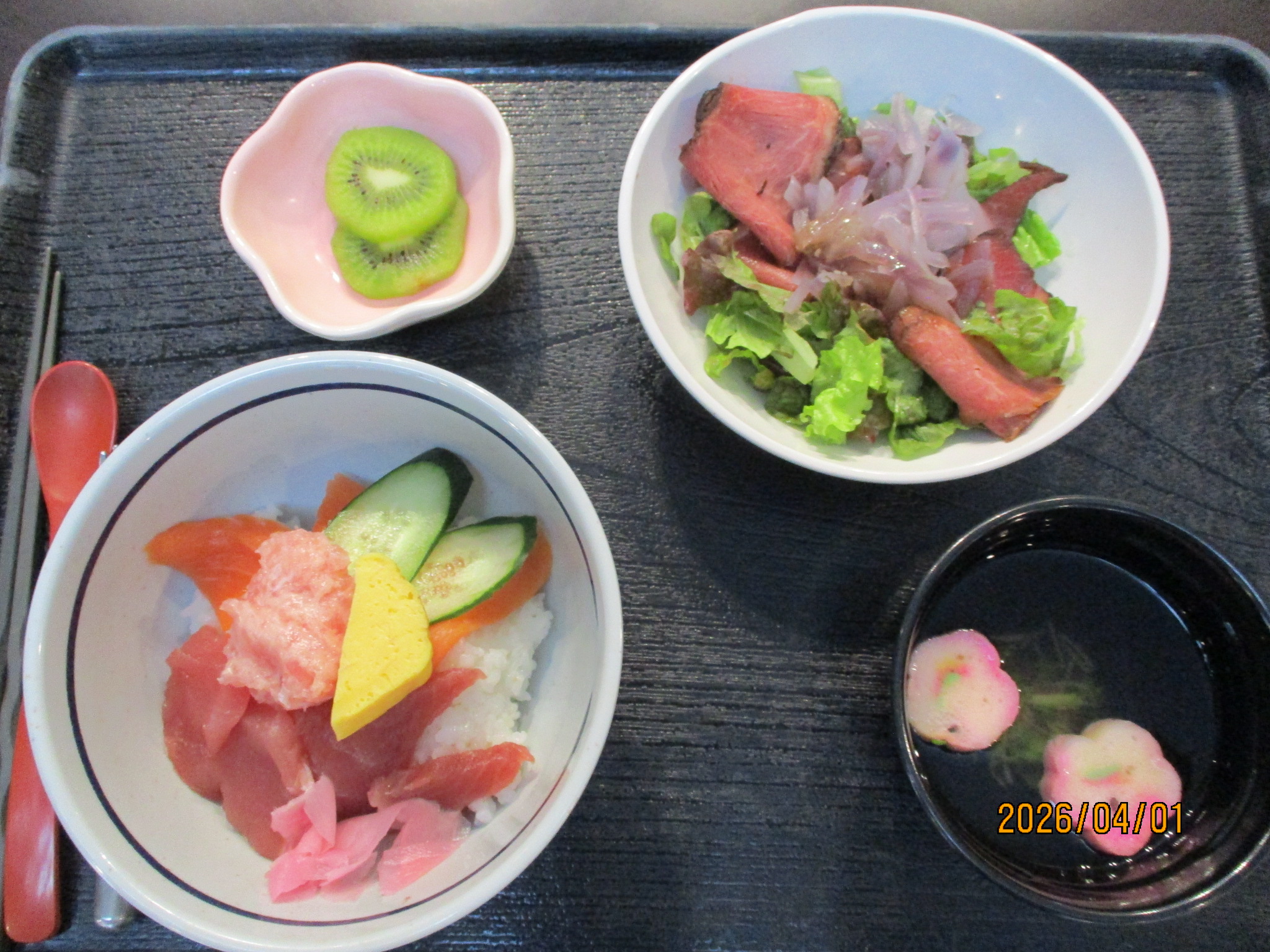 今年の開設記念献立は、海鮮丼、ローストビーフサラダ、キウイフルーツを提供しました。ご利用者様から「感動した!」と喜んでいただけました